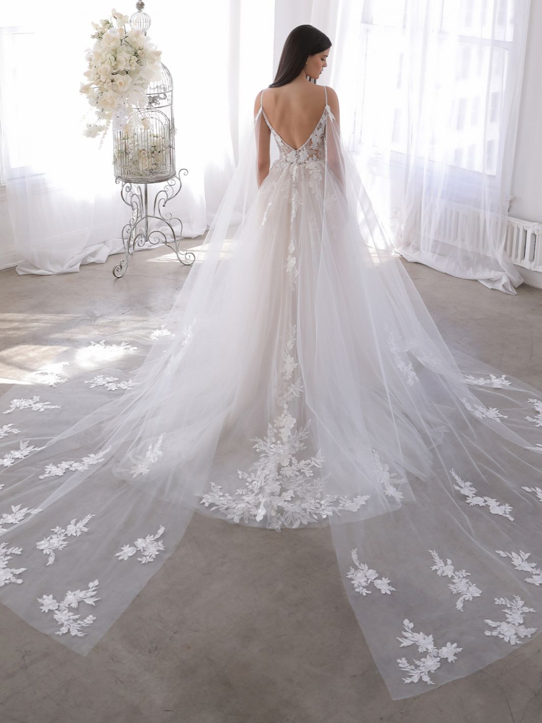 Floral embroidered lace bodice with dainty spaghetti straps, flowing into a dreamy tulle skirt. Optional detachable split cape adds an ethereal fairytale feel.