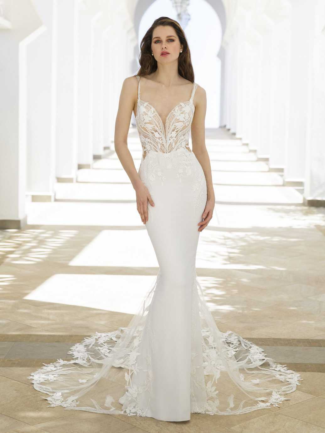 An oh-so effortless yet glamorous bridal look, RHEA will surely flatter you from every angle. The beaded straps complement the detailed bodice covered in beaded botanical and floral lace. The alluring illusion lace side cut-outs enhance your curves while the fitted crepe skirt gives a clean and refined look. The illusion back features beaded lace appliques that trickle down into a fabulous tulle train!