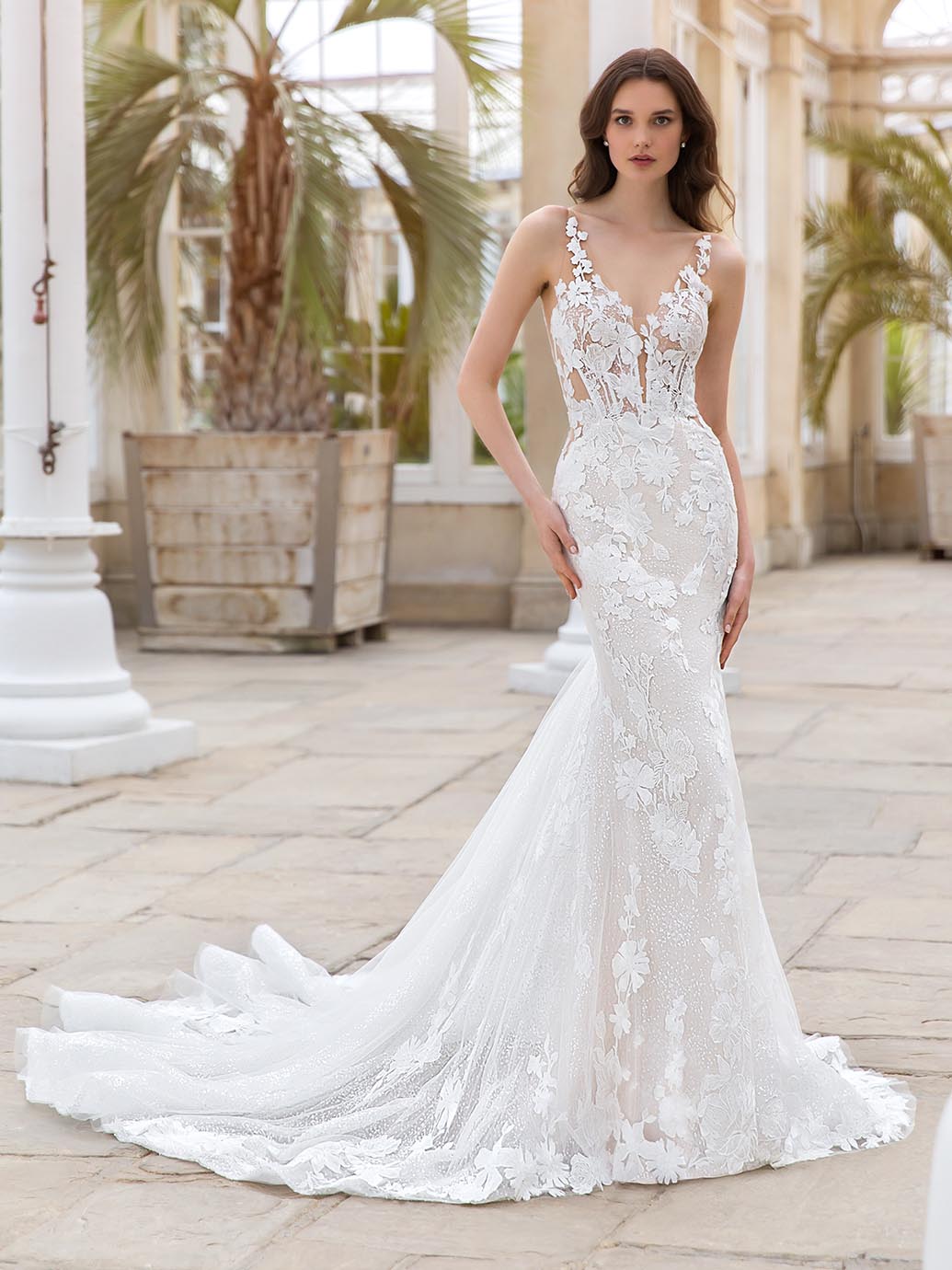 Delicate floral embroidered illusion lace straps, exposed boning on a plunging illusion neckline corset-style bodice, sexy side cut-outs, low illusion lace back, and a dramatic tulle train with sparkling tulle for glamour.