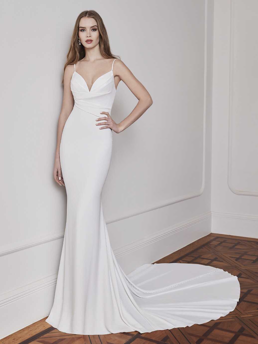 Minimalist mermaid gown with draped bodice and spaghetti straps.