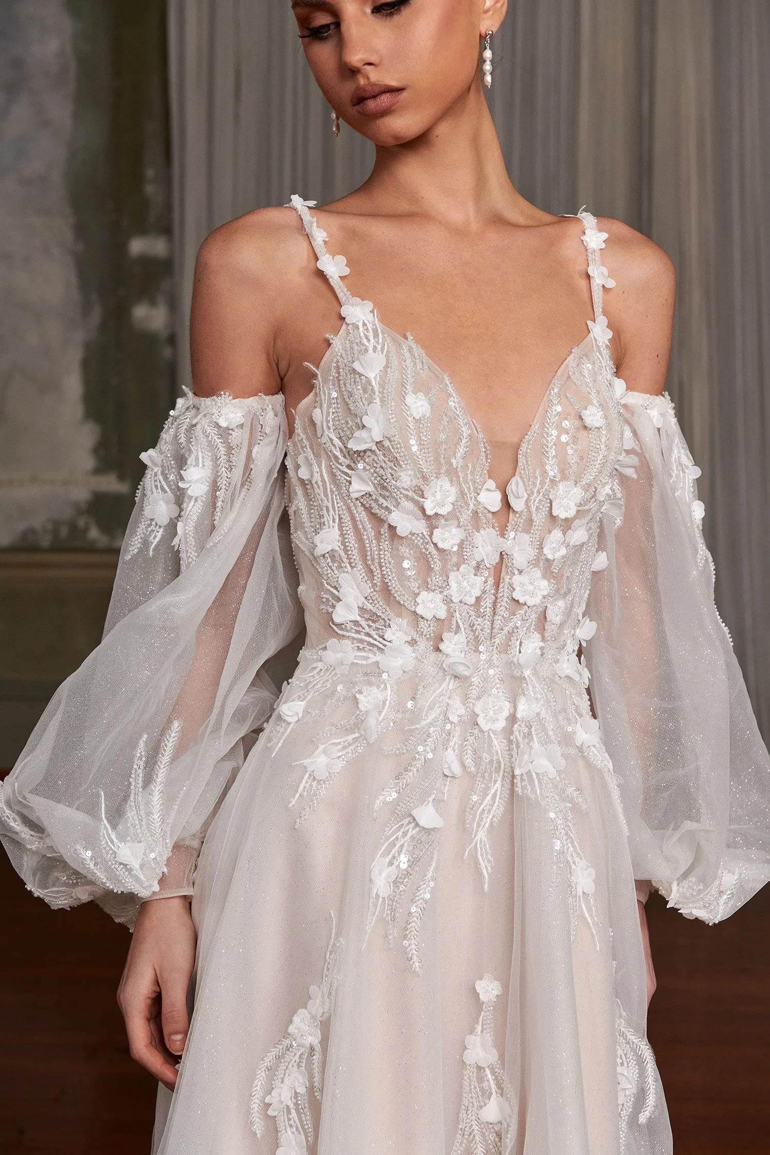 Alara is the modern-day dream wedding dress perfect for the fashion-forward maximalist bride. Her lace embroidery adorned with sequin and beads is highlighted with 3D floral motifs on glitter tulle to create a captivating and unique textural masterpiece. Her plunge V-neck illusion bodice adds drama and allure to her look, while the tulle beaded, and 3D floral straps add a touch of playfulness. Complete the look with her detachable balloon sleeves, perfect for transforming your bridal look between the ceremony and reception. Her flowing circle skirt with a horsehair hemline adds a touch of glamour and movability to this contemporary masterpiece.