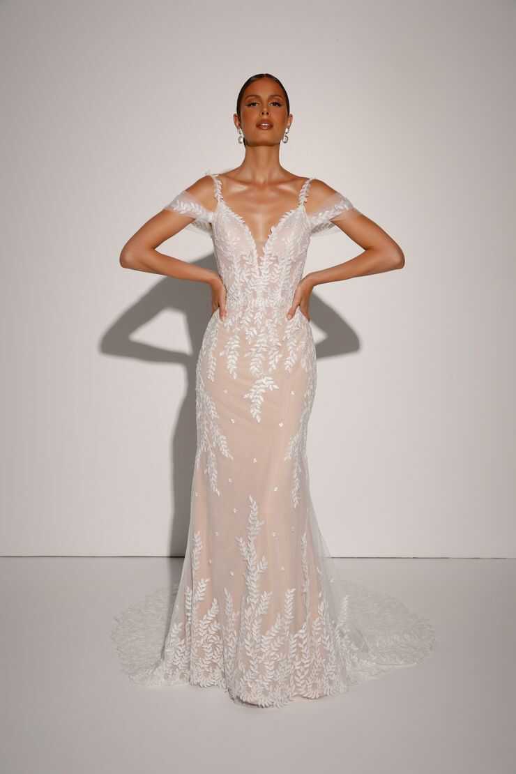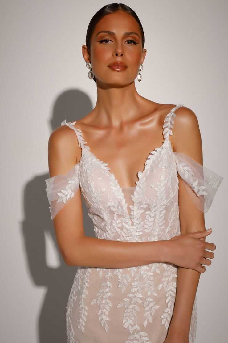 Ashlyn is a boho queen with lace placement on tulle straps to entice any modern chic bride. She boasts a V plunge illusion bodice with detachable off-shoulder tulle straps for versatility and style. Enjoy a soft and romantic silhouette with a 4 piece boning and cup construction leading to a scoop back with a button closure to complete this refined look. The embroidered lace detail with sequins is a photographers dream and the soft fit n flare skirt is photogenic from all angles. Ashlyn will make you feel like royalty as she softly shimmies over your curves and leaves you with elegant lines to make every side your good side.