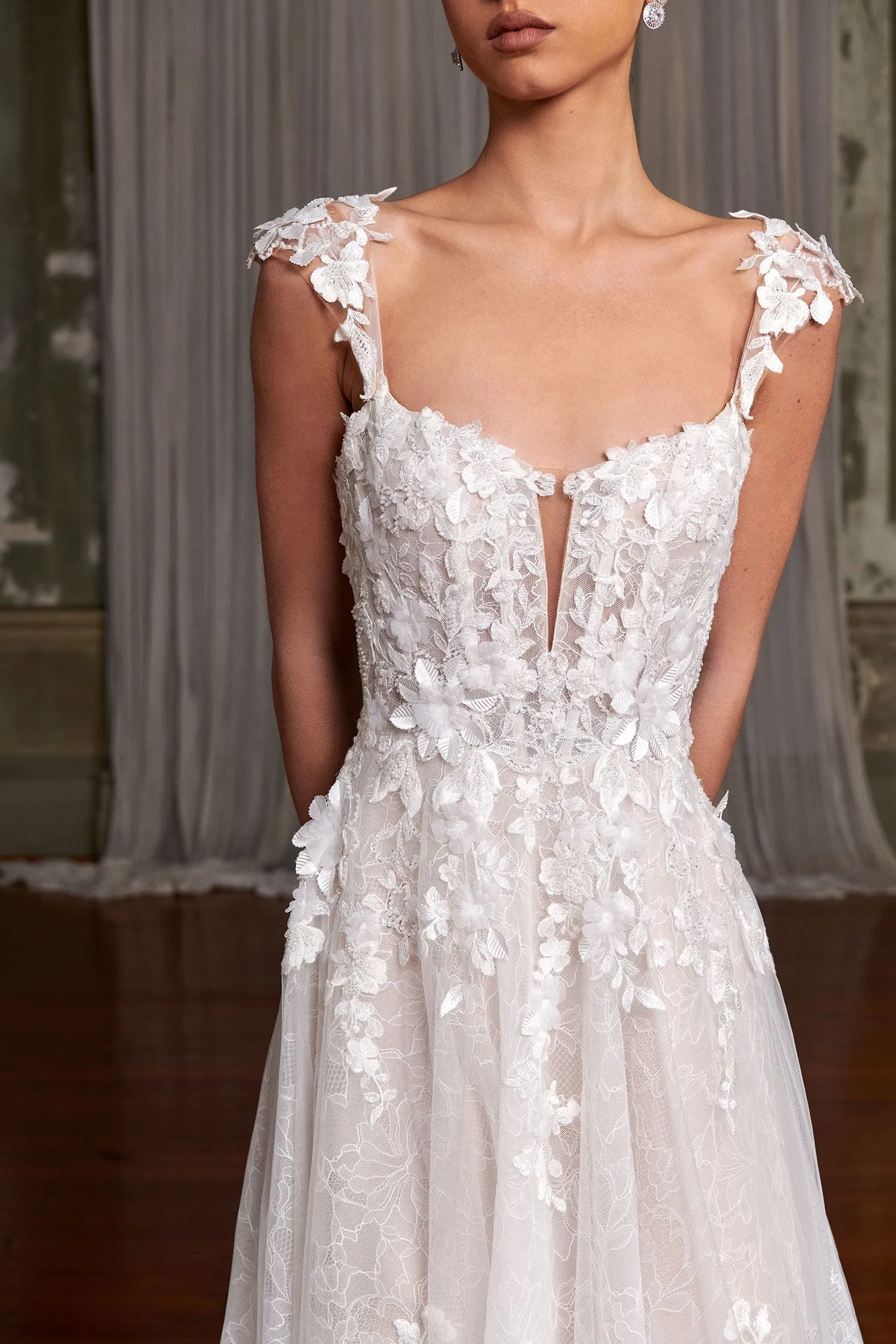 Shine like a star in Gwen, the perfect mix of glamour and sophistication fused into an elegant wedding dress. Her stunning sequin, bead, and 3D lace floral motifs are the epitome of red-carpet style, while her chantilly underlace and charmeuse lining provide glamour, comfort and cooling. The wide scoop neckline bodice with an illusion centre front plunge is the perfect way to show off your décolletage, while her tulle detachable cap-sleeve straps add a touch of versatility with a nod to classic bridal design. Her ¾ circle skirt spills into a soft illusion train and finishes with a horsehair hem for added stability and romantic touch to this show-stopping look. With Gwen, you’ll feel like a Hollywood icon.