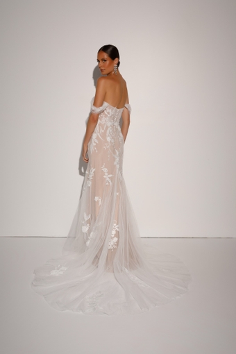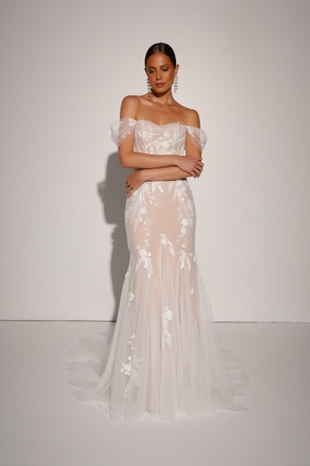 Lainey is a movie star; she is an elegant bombshell whose red carpet is the aisle. She knows where to look to give the perfect pose at any moment, with her hands on her hips and her strapless bodice and a sweetheart neckline. Lainey is beautifully structured with 13-piece boning and cup construction which will leave the guests breathless. Lainey is for the bride who knows what she wants and is the perfect combination of strong and delicate with embroidered modern 3D lace motif and a soft fit n flare skirt with fine tulle godets for softness. As every Evie dress, Lainey is versatile for the bride who wants a more classic silhouette with detachable illusion pleated tulle off shoulder straps. Wow your guests and feel like a million dollars in Lainey as you strut down the aisle with all eyes on you.