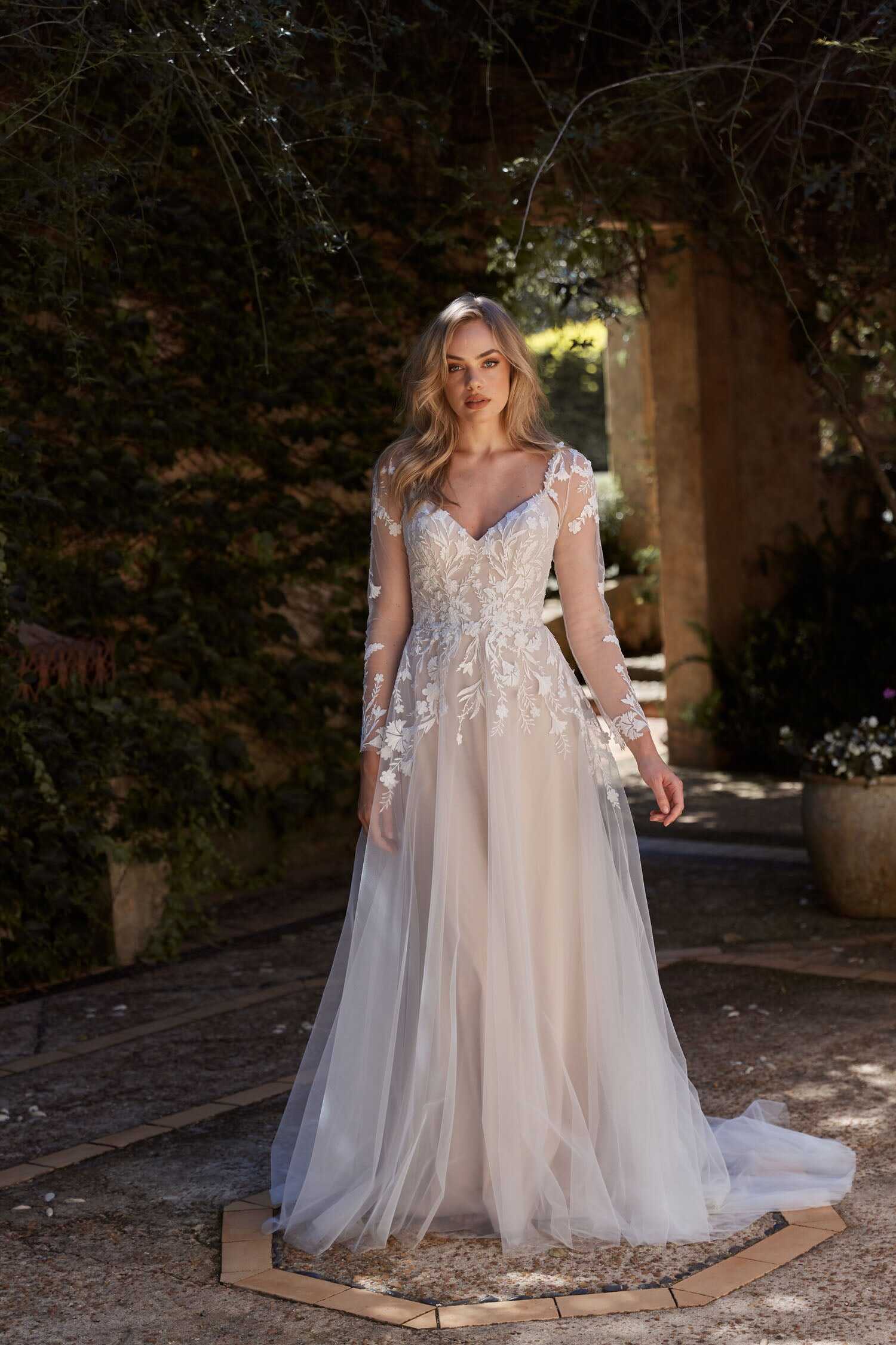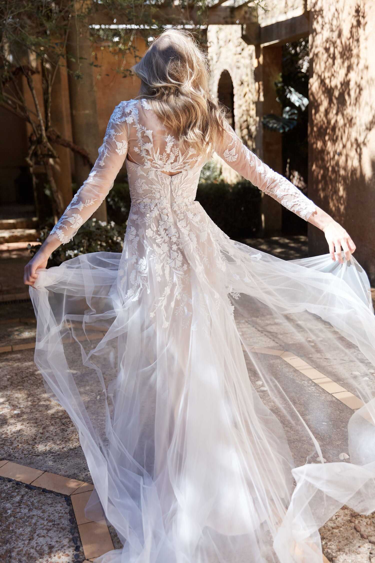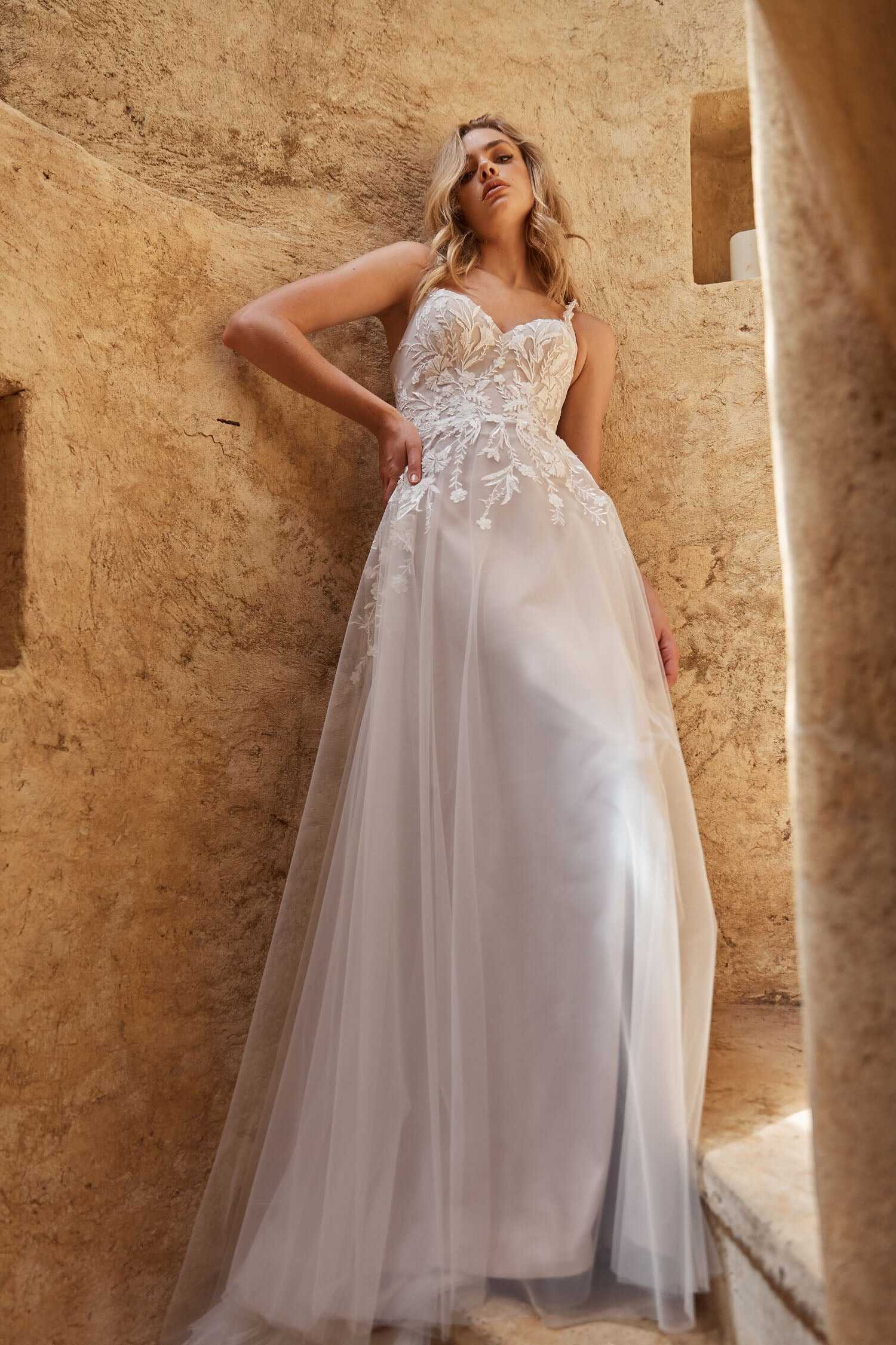 Wildly romantic and delicate, Lane is one for the starry-eyed lovers. She details layers of soft tulle, with embroidered lace appliques. Her V-neck bodice features embroidered design lace applique placement flowing down to chiffon flowers. Divinely soft and feminine, her circle skirt is full of movement.