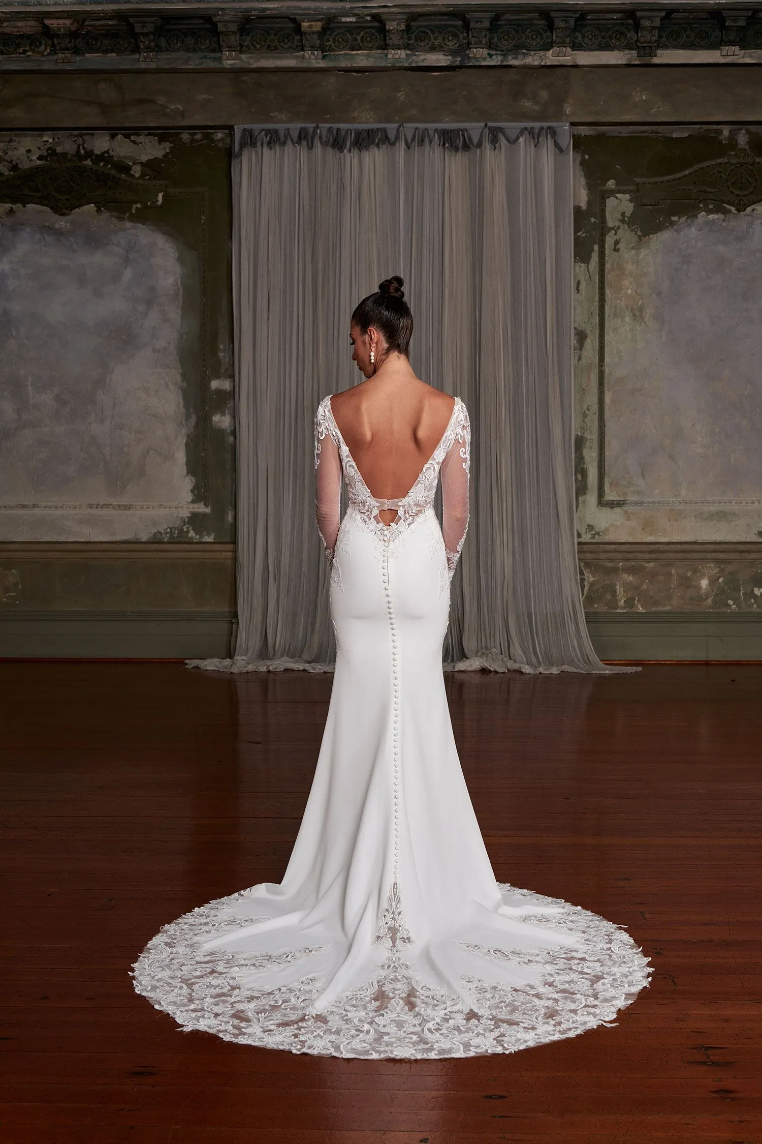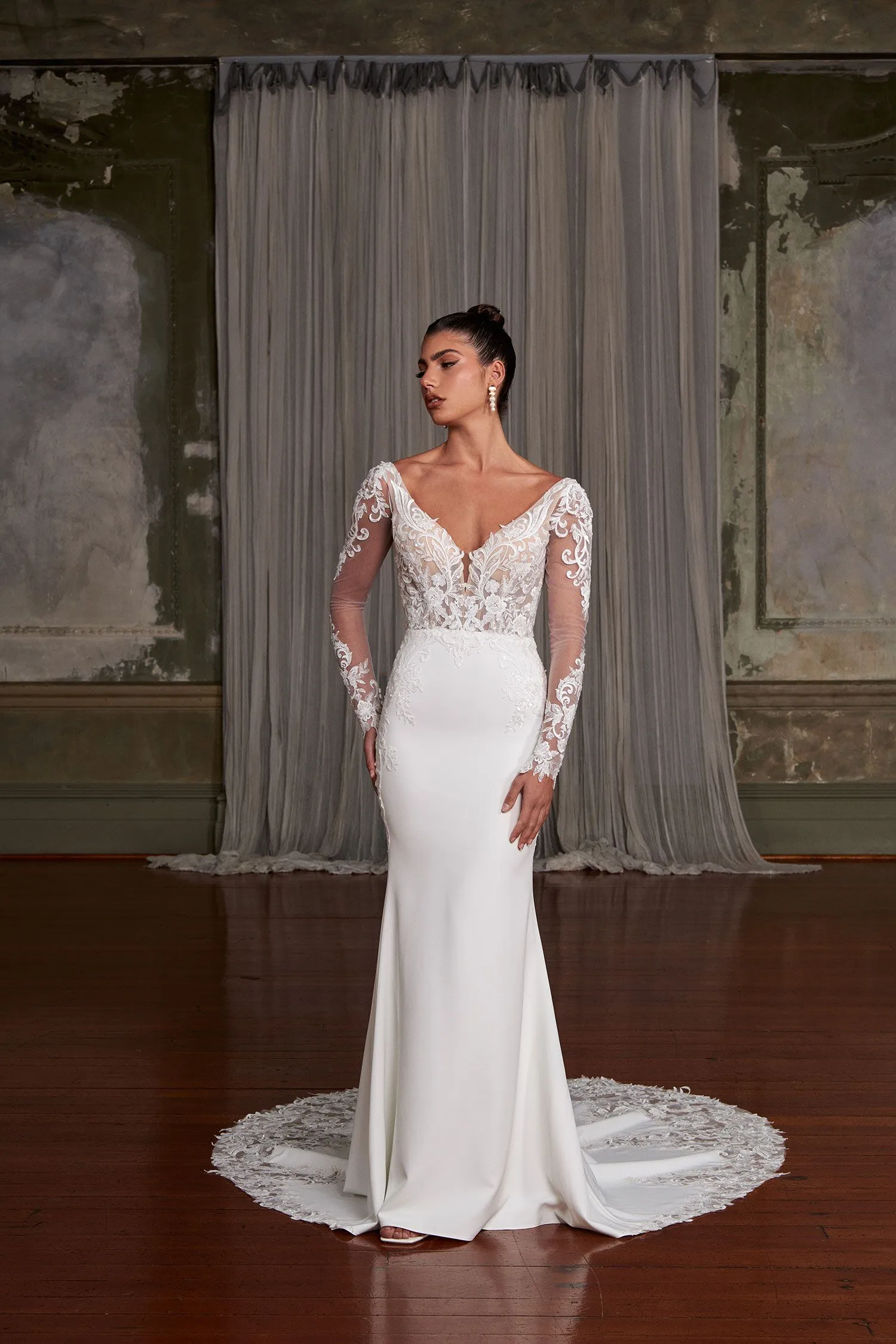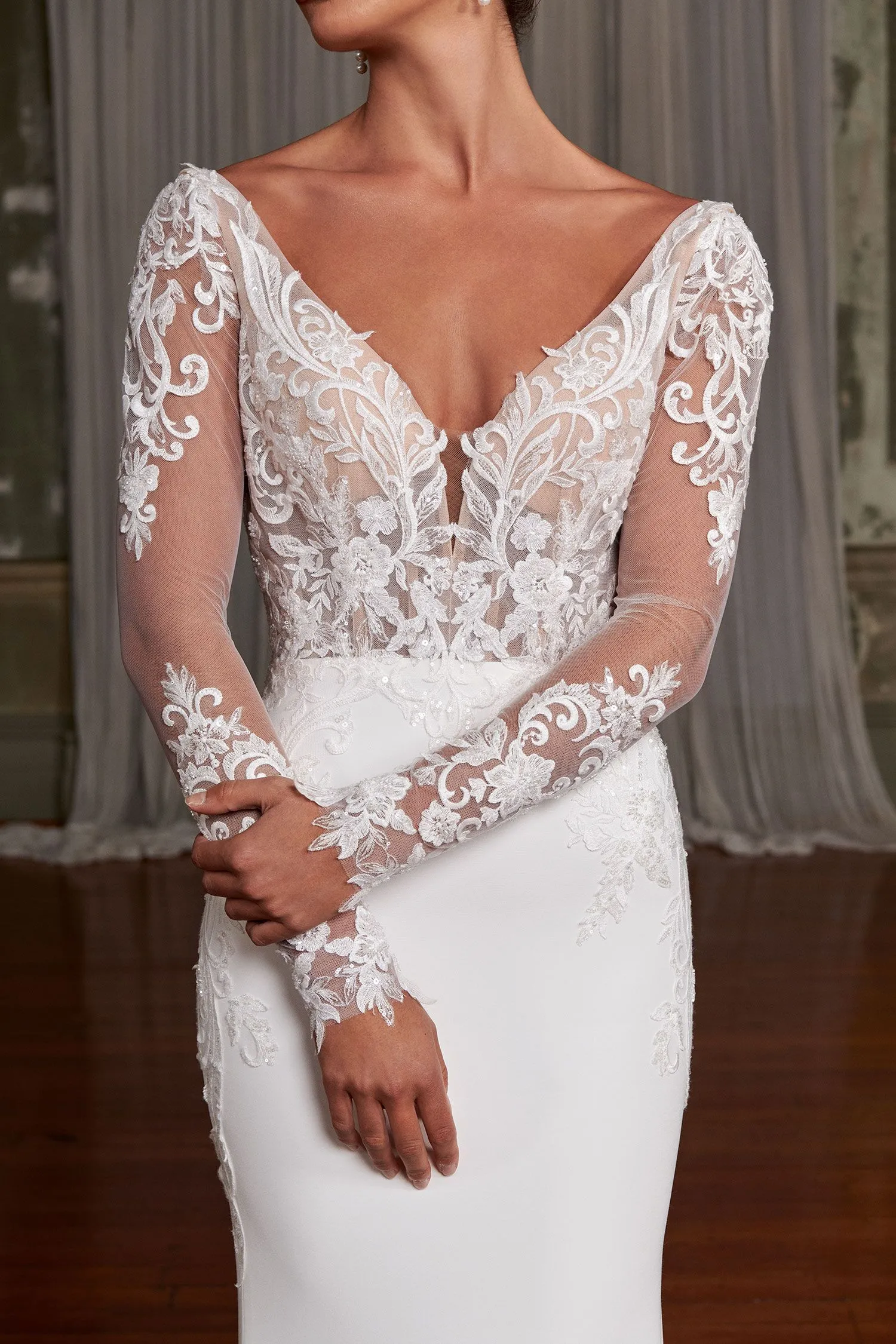Step into the spotlight with Nya, the perfect blend of modern and timeless bridal style. Her exquisite embroidery, sparkling sequins, and intricate bead motifs are the epitome of elegance, creating a chic and stunning wedding gown. Her light crepe fabric and jersey lining ensure maximum comfort without sacrificing style. Her plunging V-neck illusion bodice and deep V-back with a keyhole make a bold statement, while the detachable long sleeves provide versatility. The bodice and sleeves feature a sequin beaded lace motif that delicately draws down to the outline of the hips. Nya’s slimline skirt with an illusion train finishes with a matching detailed sequin. Her beaded lace adorns a jaw-dropping silhouette, perfect for your grand entrance. Nya is fit for a celebrity; bring out your inner J-Lo with this slinky, curve-enhancing gown.