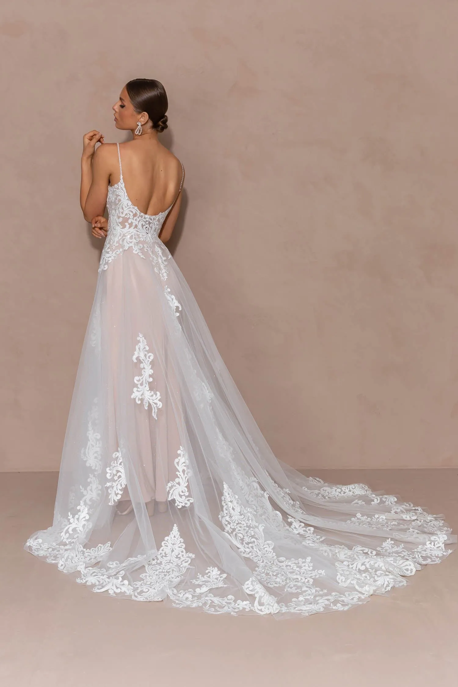cord motif fabric, enhanced with glitter tulle and beaded straps. The V neck illusion bodice teases with a deep plunge detail, whilst the scoop back and centre back buttons creates a harmonious design feature. Rich, unique lace detailing flows and delicately disperses downwards from the bodice and over the hips to create glorious focal points on the full circle skirt and 30″ illusion train. For ease of wear and confidence throughout the day, the gown features 4-piece boning construction, fitted cups, and a lovely soft stretch jersey lining. Rio is a showstopper in sizes 2 to 28, and she’ll have you looking and feeling your best on your wedding day.