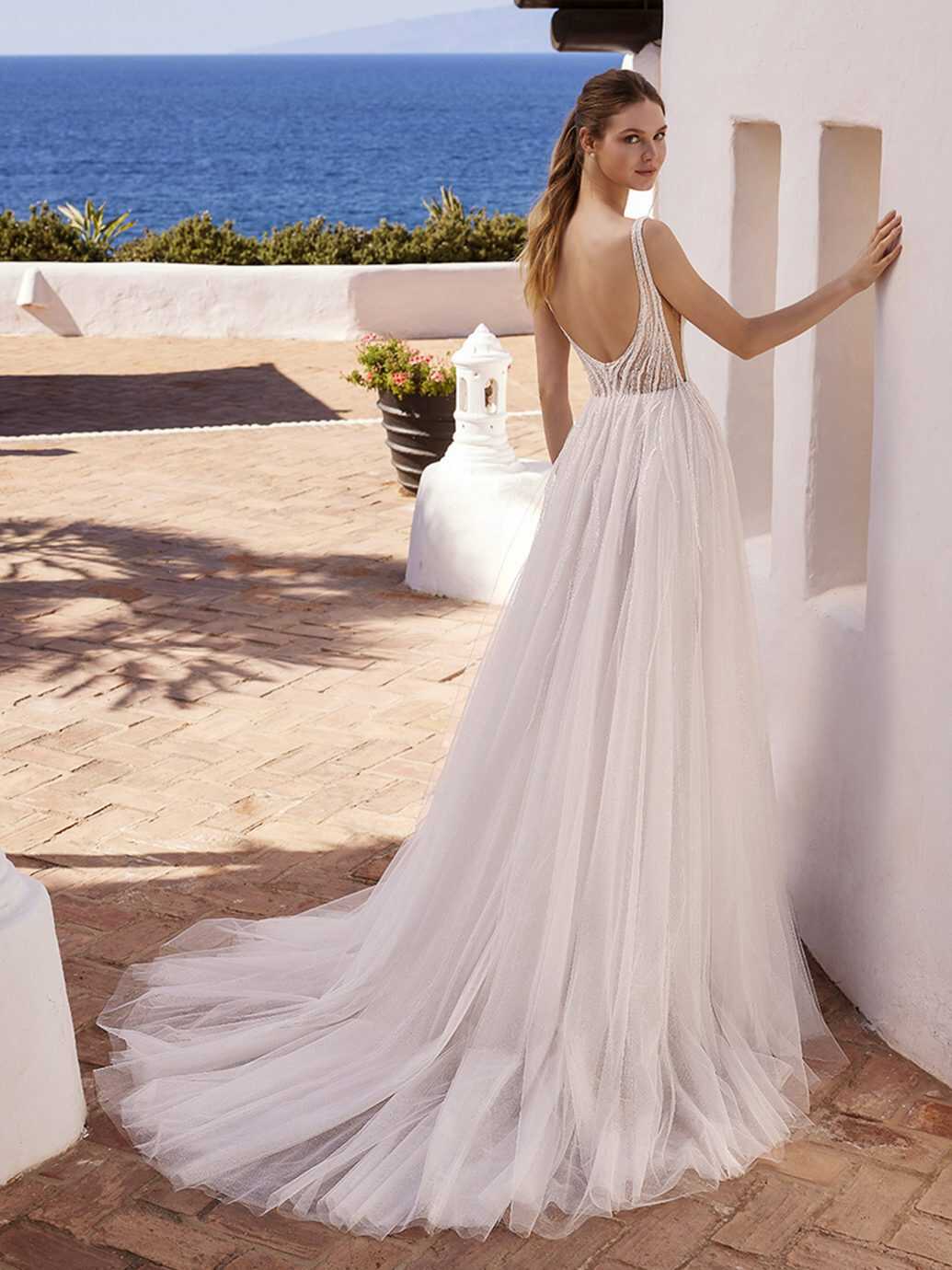 Pure bridal magic in CAROLINE, featuring her dazzling beaded linear lace. This show-stopping A-line gown includes a flattering scoop neckline with supportive straps and illusion side cut-outs for a gorgeous fit. The glamorous beaded lace is bejeweled on the bodice and back, cascading down into a graceful glitter tulle skirt and peek-a-boo slit for a whimsical finish.