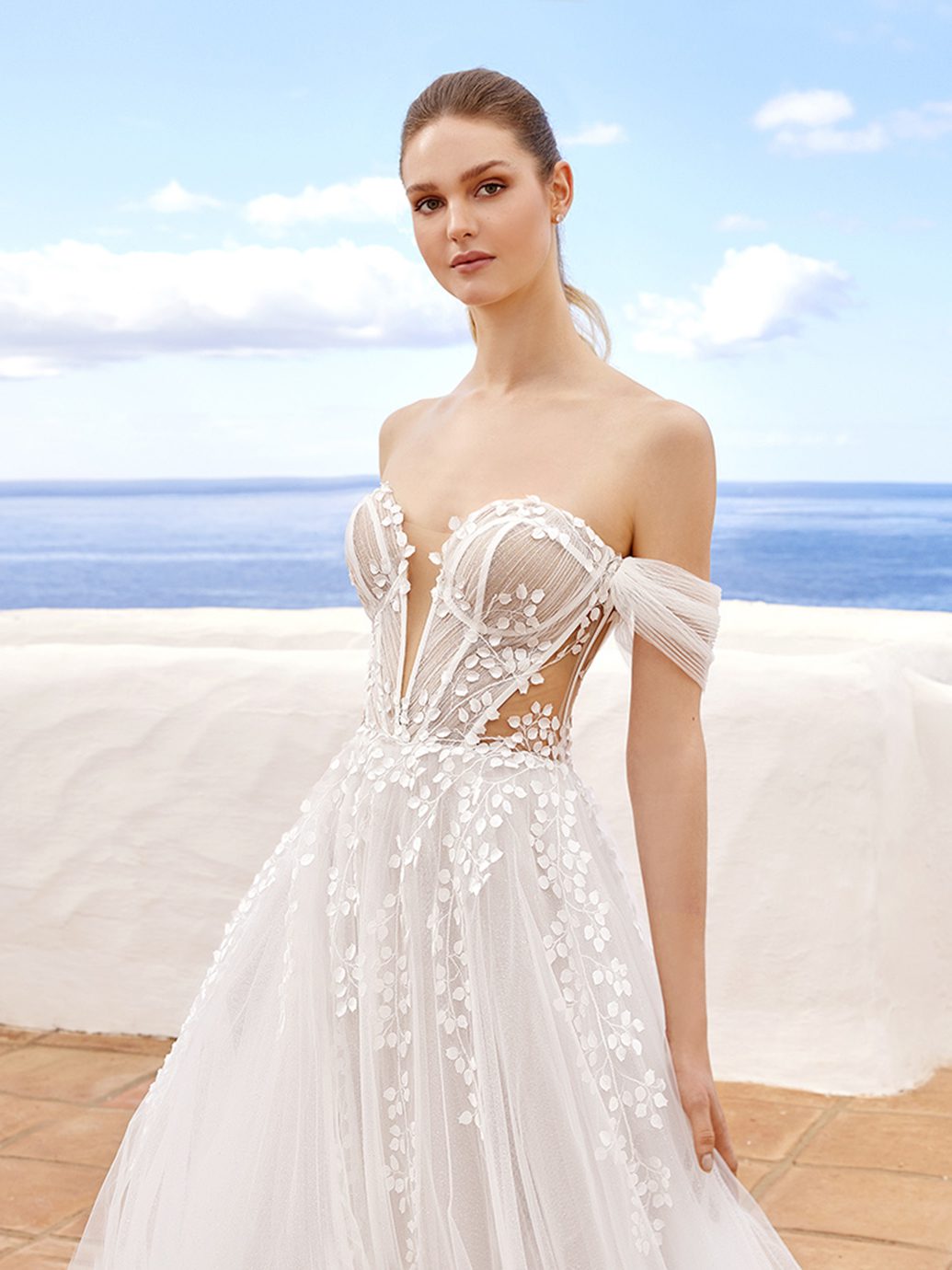 Leaving us in a trance, CLAIRE is perfect for our dreamy romantics. This ethereal A-line beauty showcases a plunging sweetheart neckline with intricate 3D floral motifs and embroidered lace atop sparkly glitter tulle fabric. The romantic exposed corset boning, illusion side cut-outs, and off-the-shoulder tulle straps tie together to create an enchanting bridal look. The lovely lace is carefully placed along the corset-style back and peek-a-boo slit, trickling down into a soft and sparkly tulle skirt.
