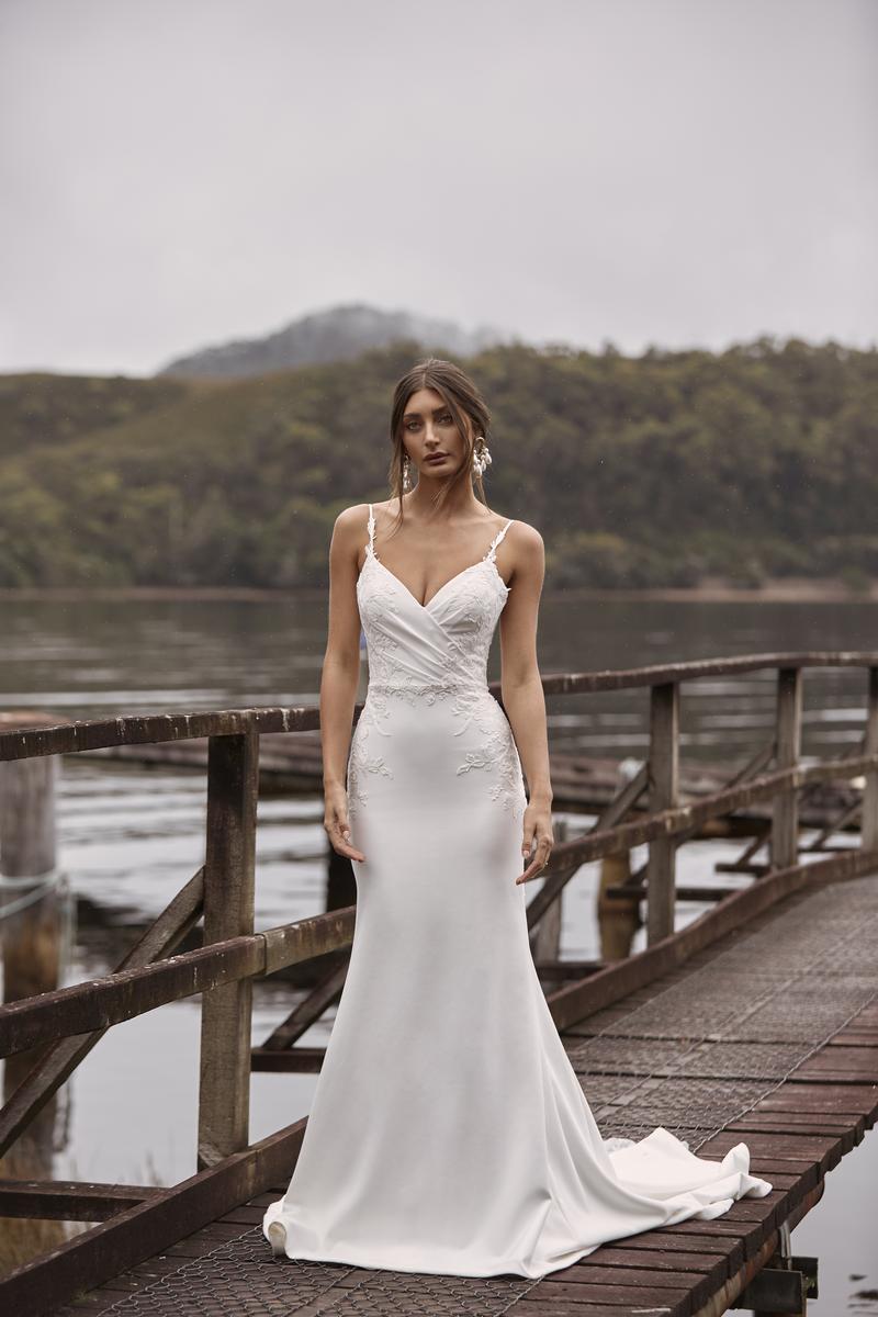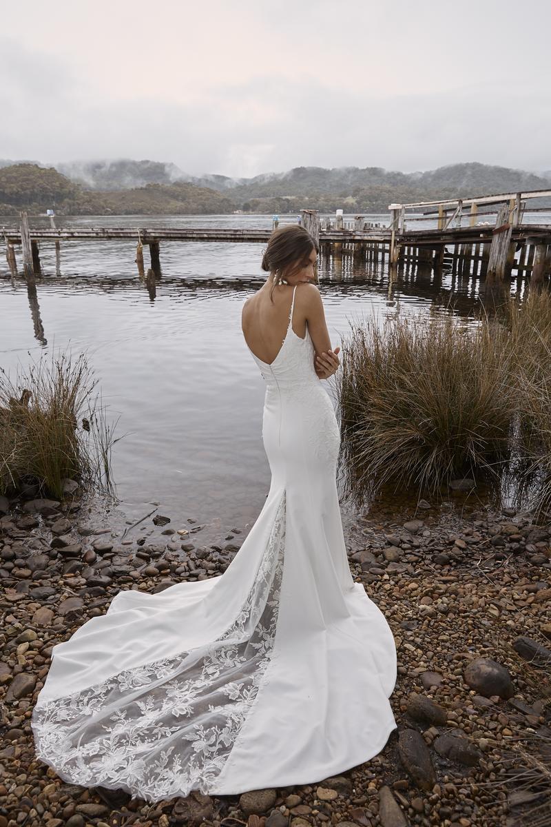 Madi Lane Connor has a slimline silhouette with a gentle fit and flare and the 4 way stretch jersey lining moulds and shapes seamlessly on her bride. Her bodice features a V neckline and narrow straps that are softened with delicate lace appliques. Cleverly crafted pleats shape the bodice adding another layer of detail while lace appliques decorate her sides and define her waistline. Floral lace with high reaching leaves elevate this design with high definition detail. Buttery stretch crepe hugs the hips while lace appliques cascade down to the fingertips.