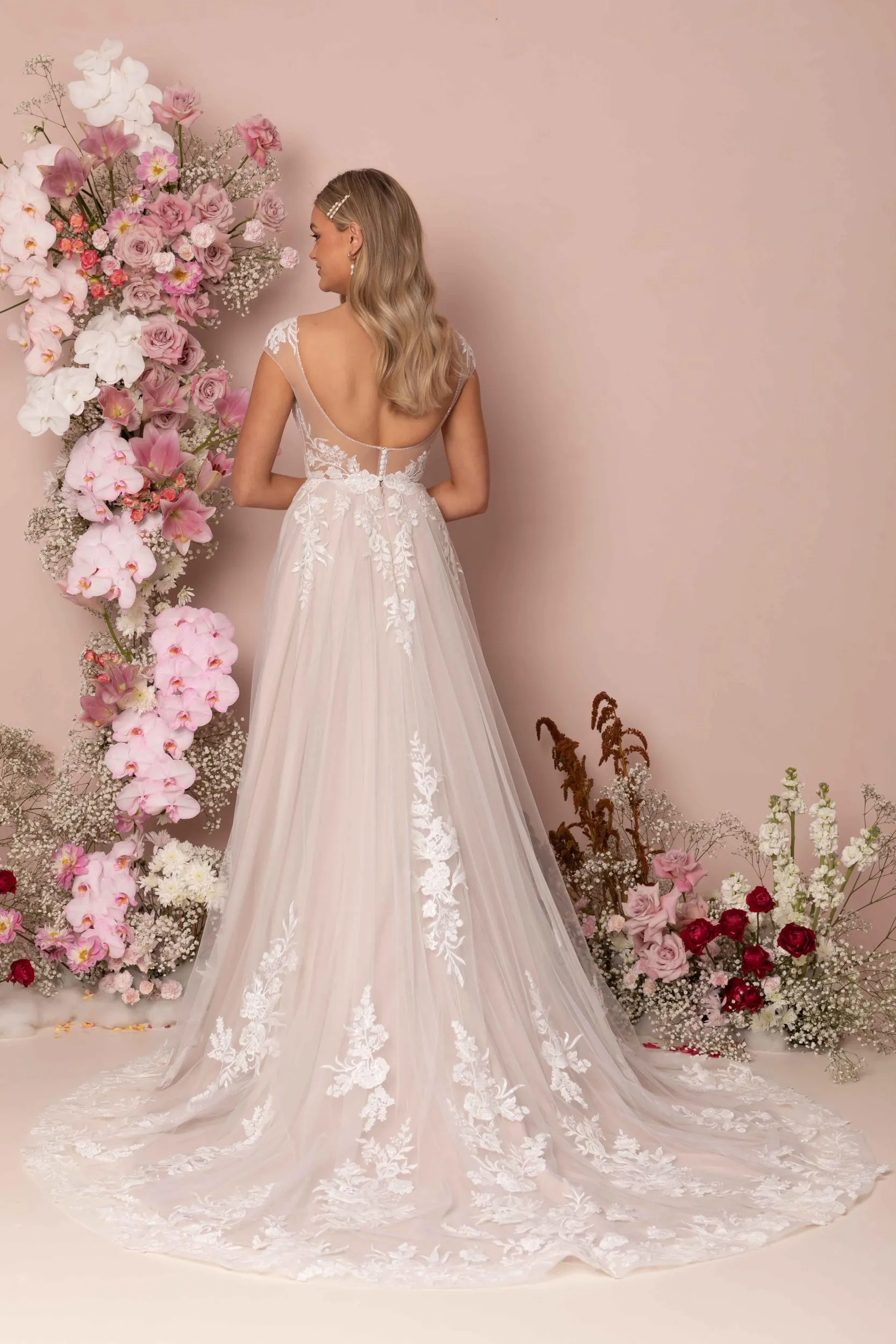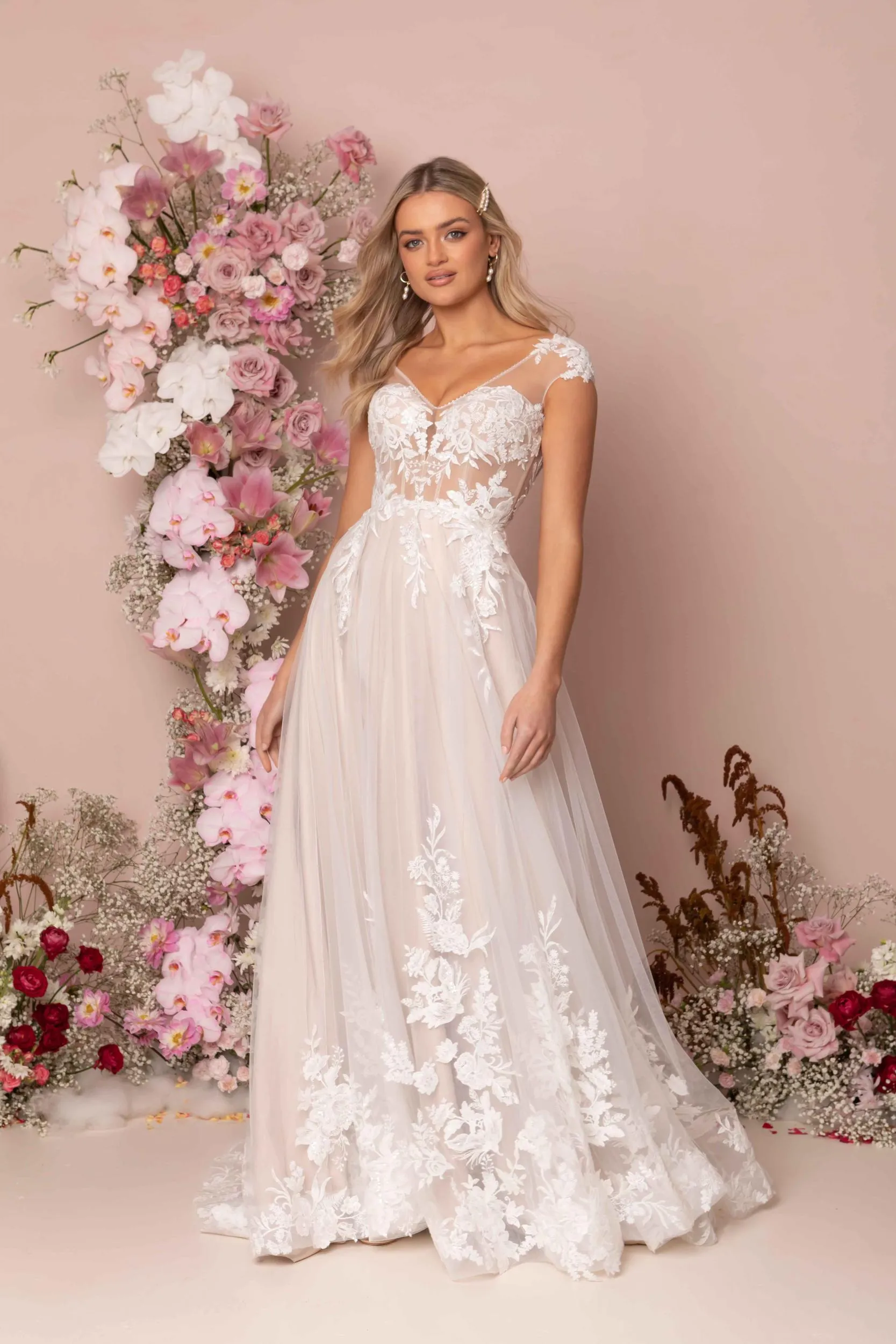 Embroidered lace adorned gown with delicate sequins, V-neck illusion bodice with beaded detailing, and cap sleeves.