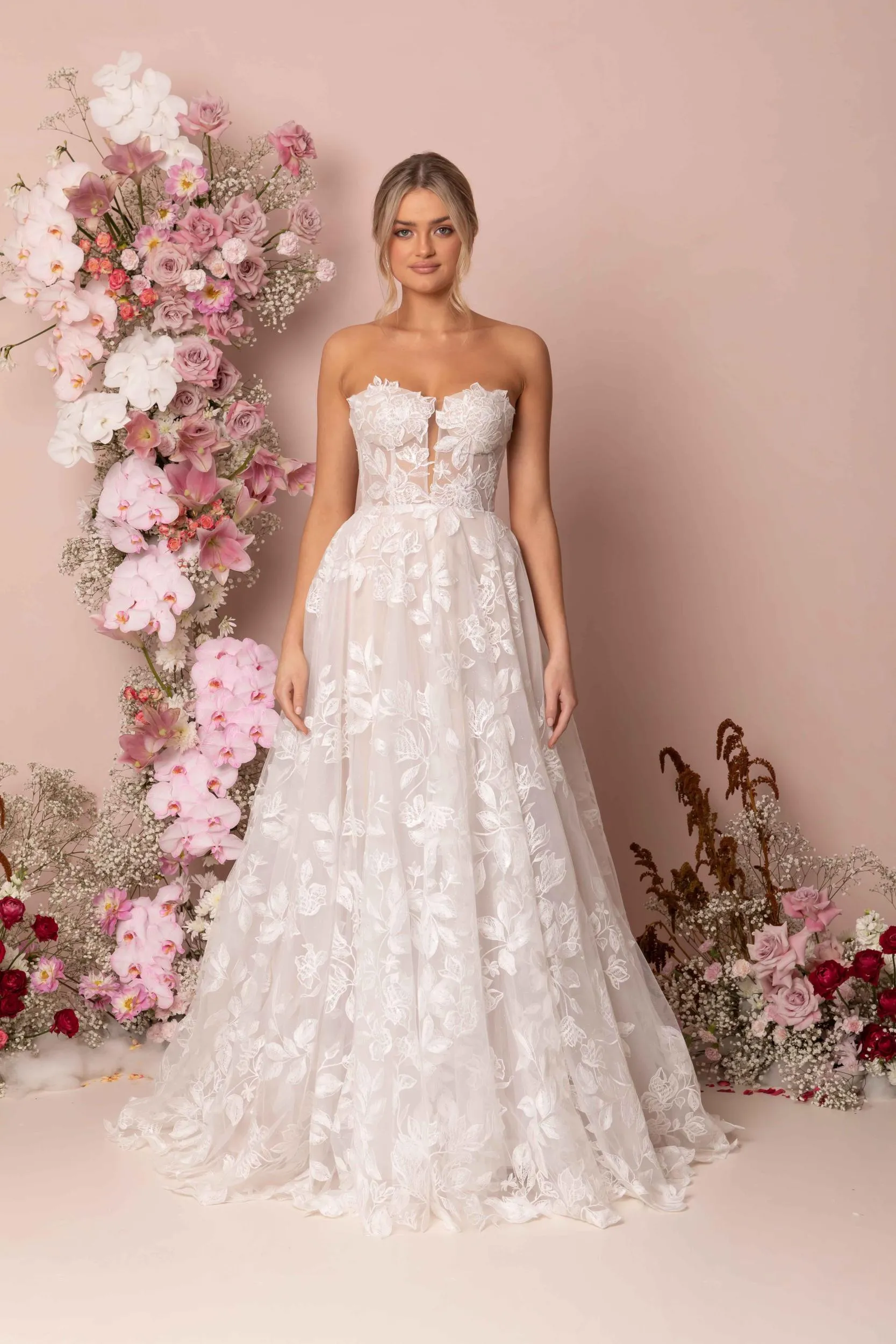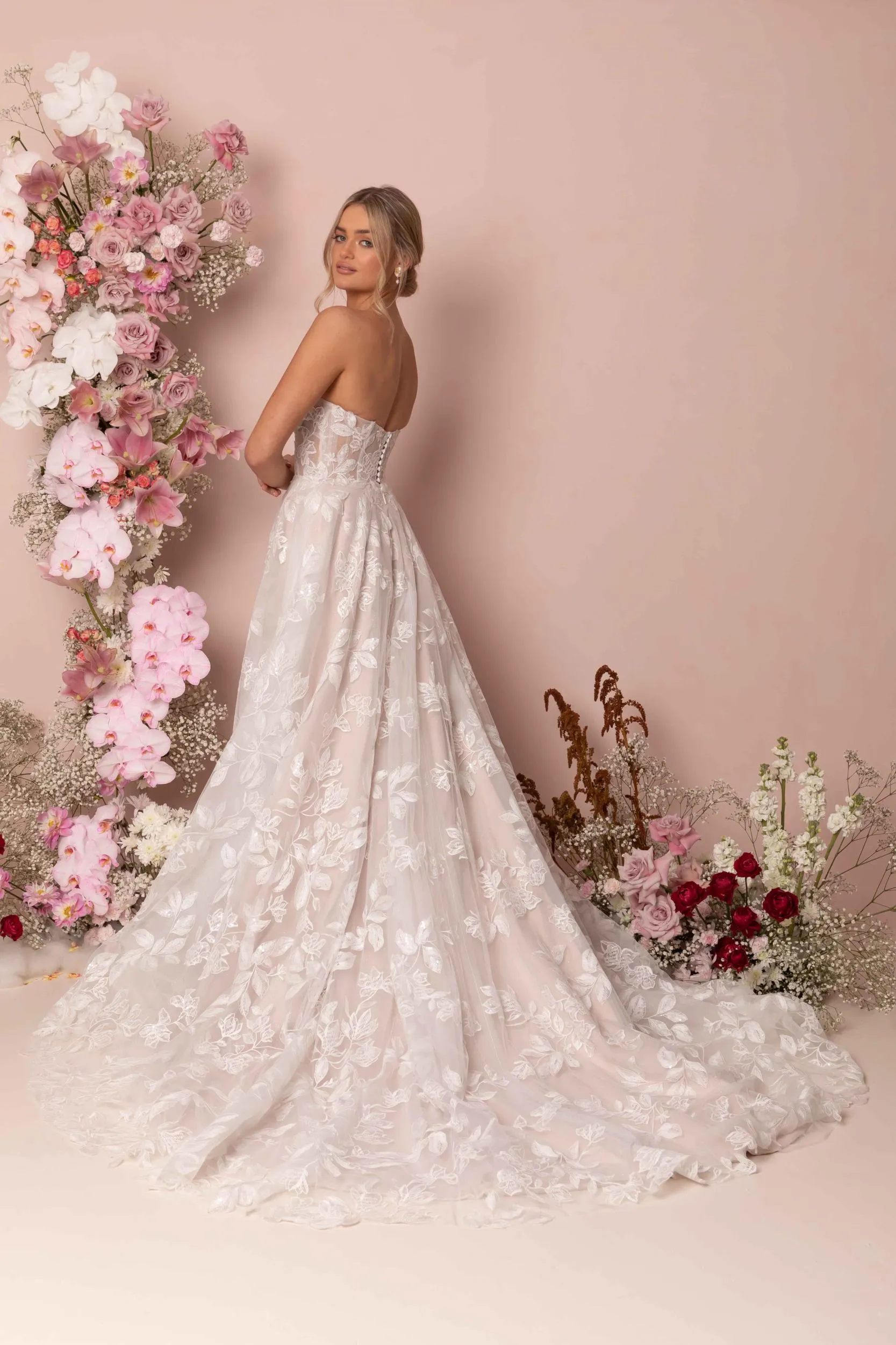 Floral sheet lace with glitter tulle, sweetheart neckline, illusion bodice, buttoned back, and a full circle skirt with train