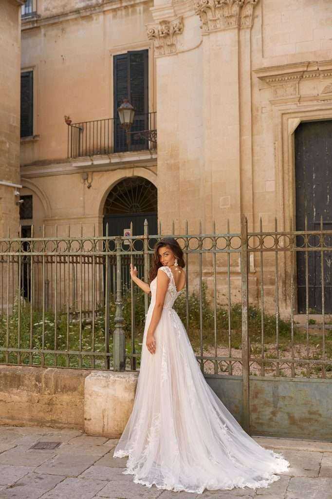 She is the essence of love which blossoms from the feminine cap sleeves to the full skirt which blooms behind. Madison’s buds of botanical flowers curve around her bodice and cluster in the center before effortlessly trickling down the length of her gown, creating an elongating effect. Madison is a vision for any bride looking for a spring glow as the flower appliqués finish off the dress by flourishing around the hem. Her V neckline exposes much of her décolletage which is slightly mirrored when she turns with a softer V back.