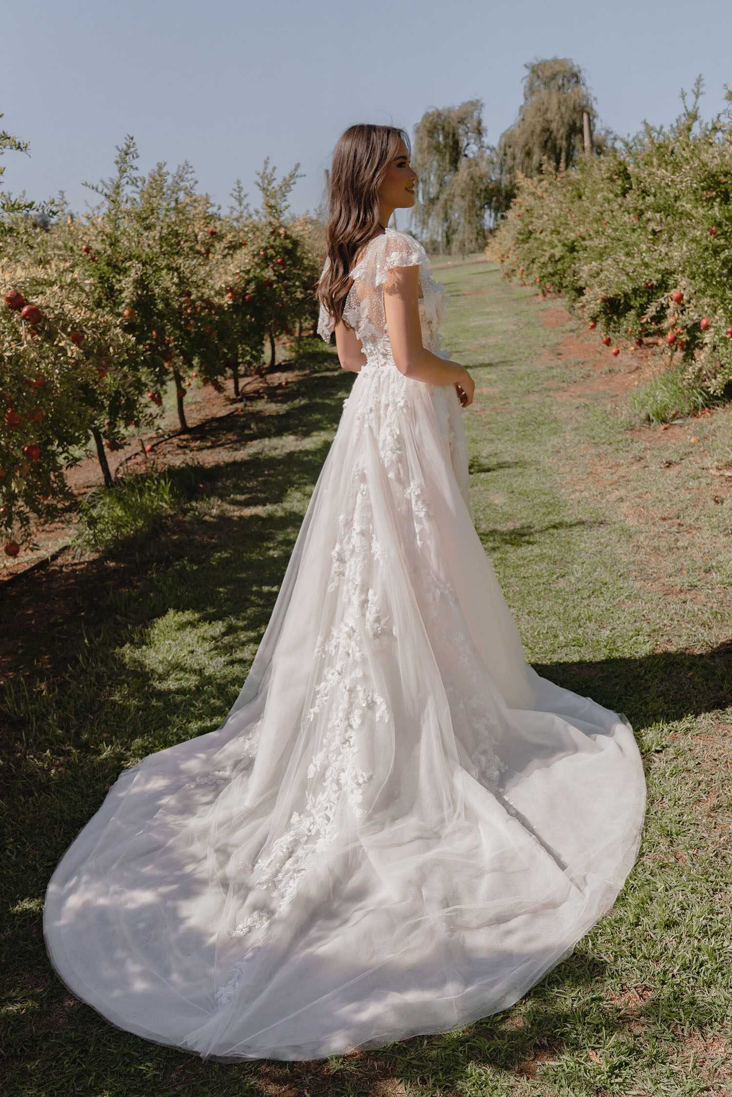Meet Sannah, an enchanting wedding dress that embodies the allure of a princess in an A-line silhouette. Her illusion plunge V neckline adds a touch of sophistication, while the 3D floral bodice cascades with delicate petals down the pleated tulle skirt, creating a mesmerizing botanical wonder. As you walk down the aisle, her dramatic train leaves a lasting impression, exuding grace and elegance.