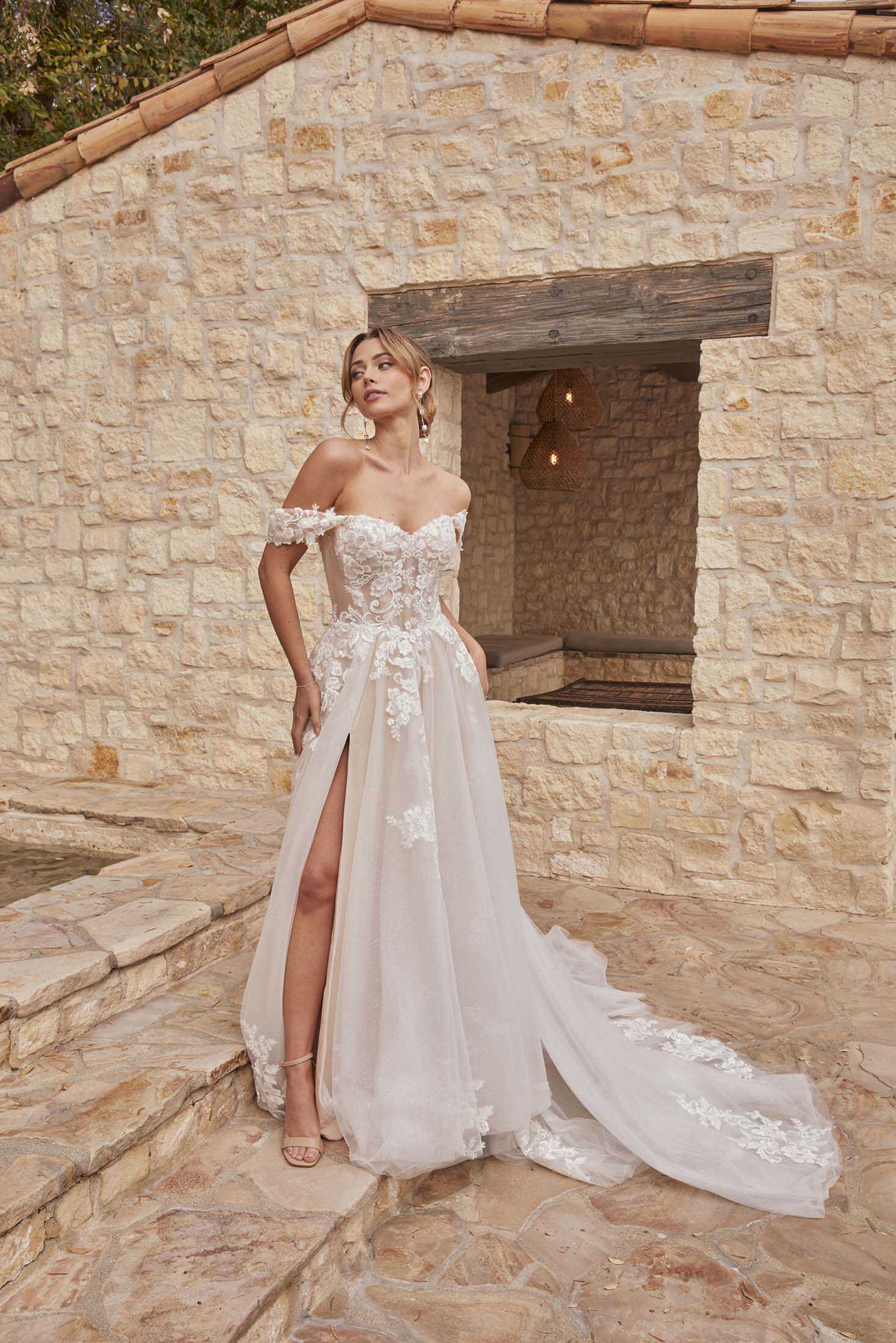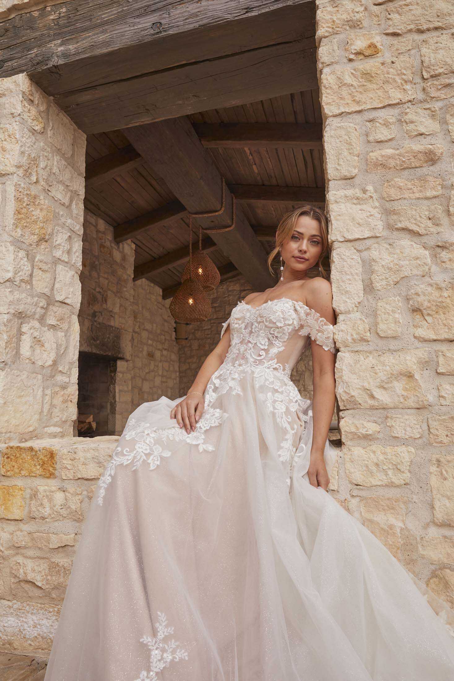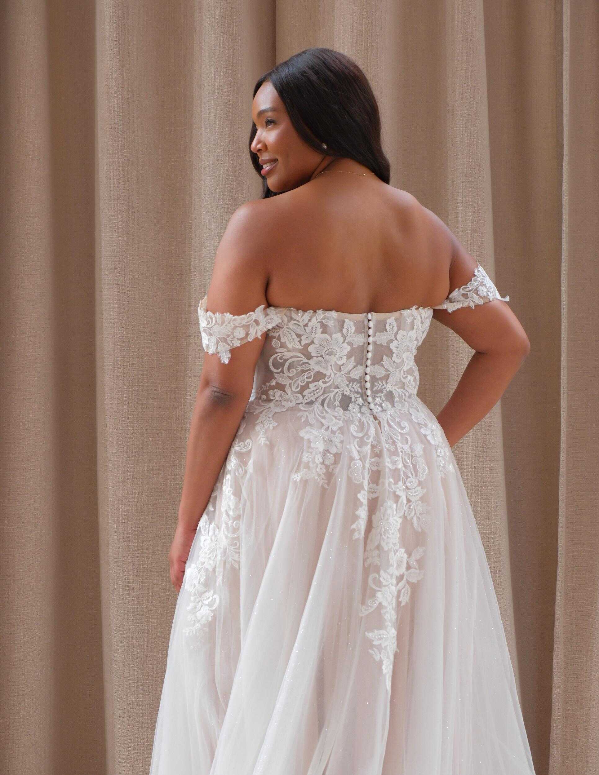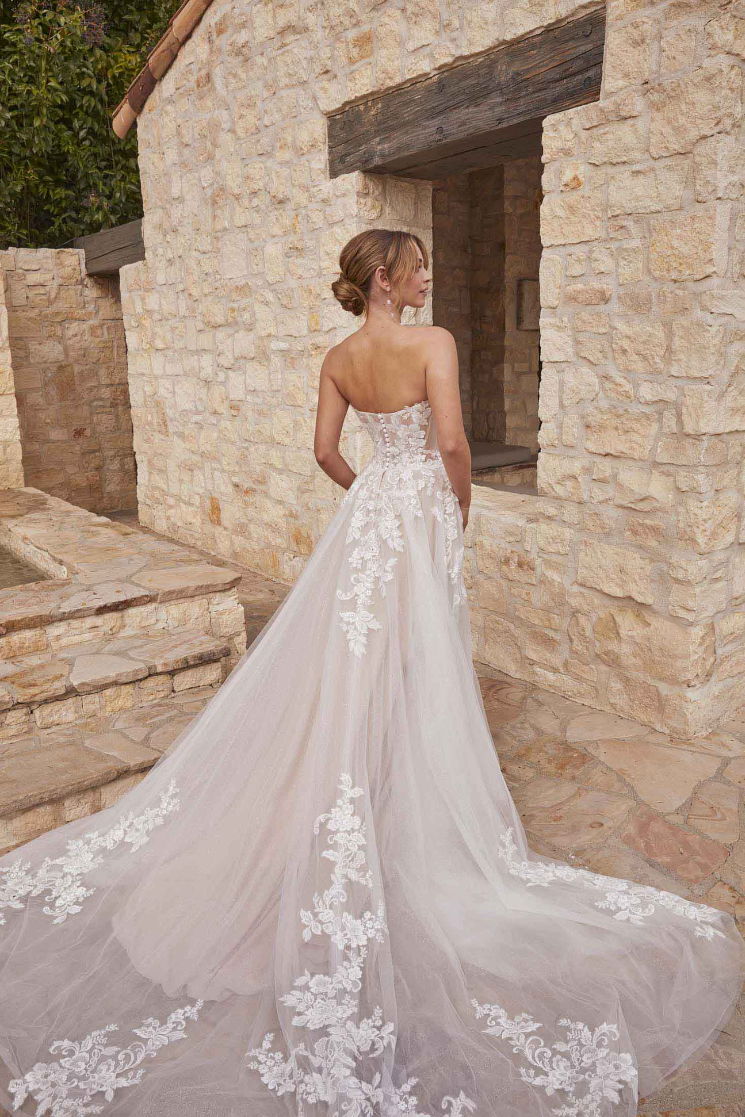 Elegant lace and tulle gown with detachable straps, ideal for the sophisticated bride’s timeless romance.