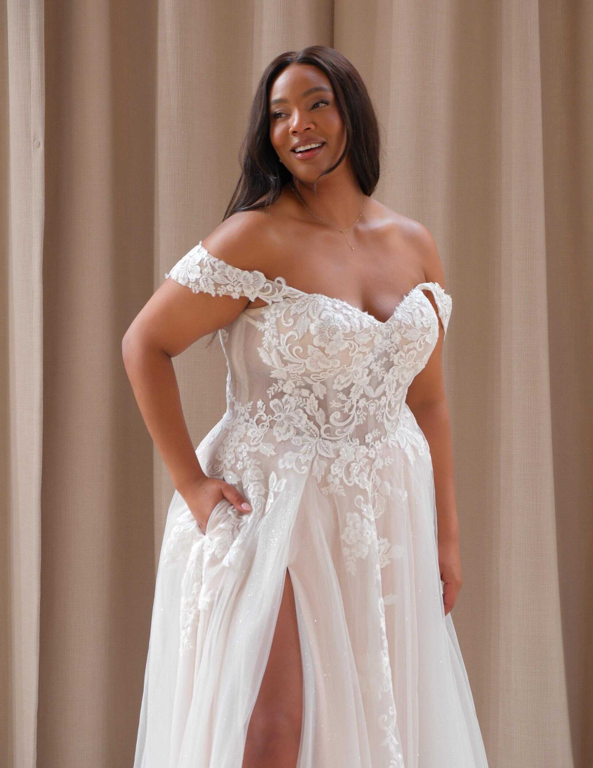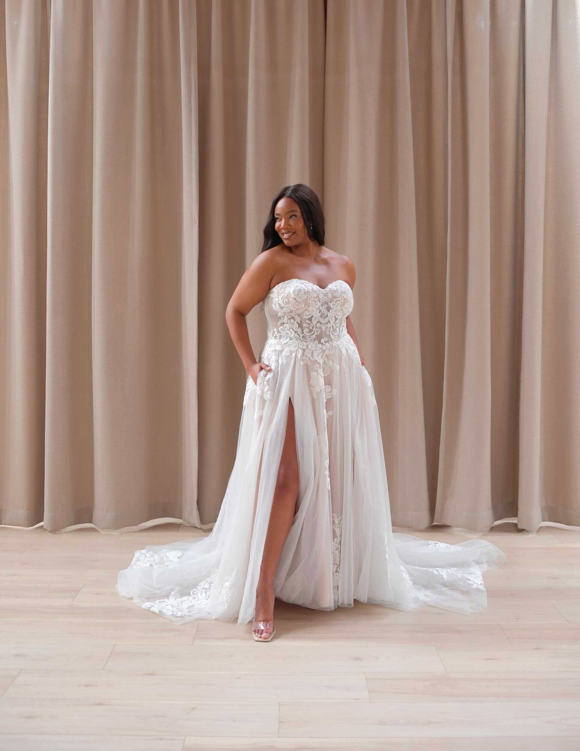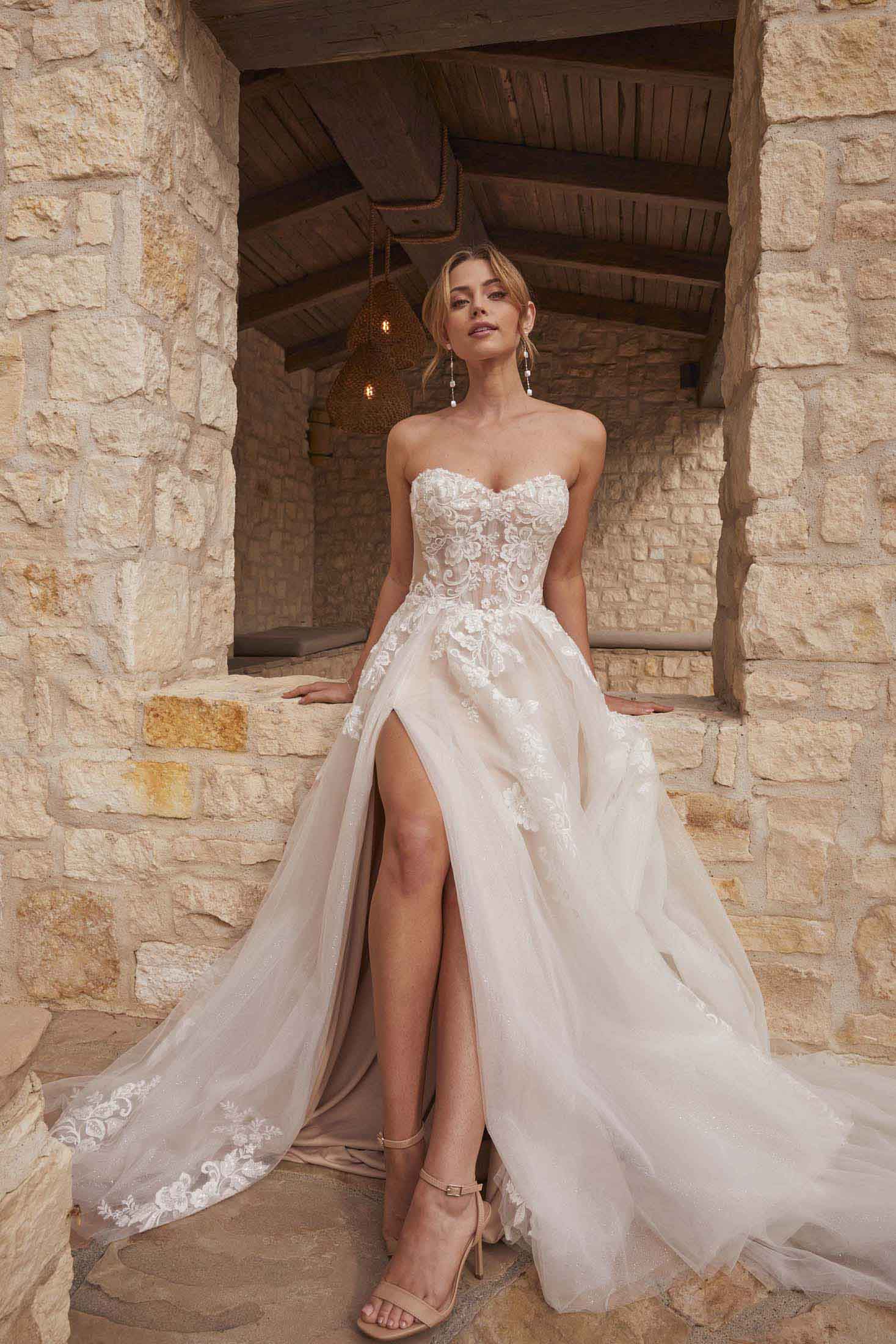 The Chantal wedding dress epitomizes timeless elegance with a touch of modern allure, catering to the sophisticated bride seeking a blend of tradition and contemporary flair on her special day. Crafted from delicate lace and ethereal tulle, the strapless bodice exudes classic charm, offering a timeless silhouette. For added versatility, detachable straps are included, providing options for the bride’s preferred neckline style. The flowy tulle skirt, adorned with intricate floral lace appliqués, flows gracefully to the floor, while a thigh-high slit adds a hint of allure and movement. Inspired by the romanticism of vintage love stories, the Chantal dress is perfect for an elegant garden wedding or a chic countryside affair, embodying the essence of timeless romance and understated sophistication.