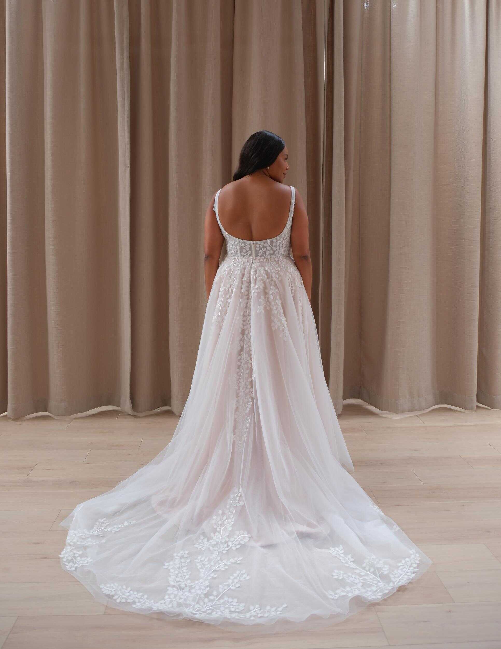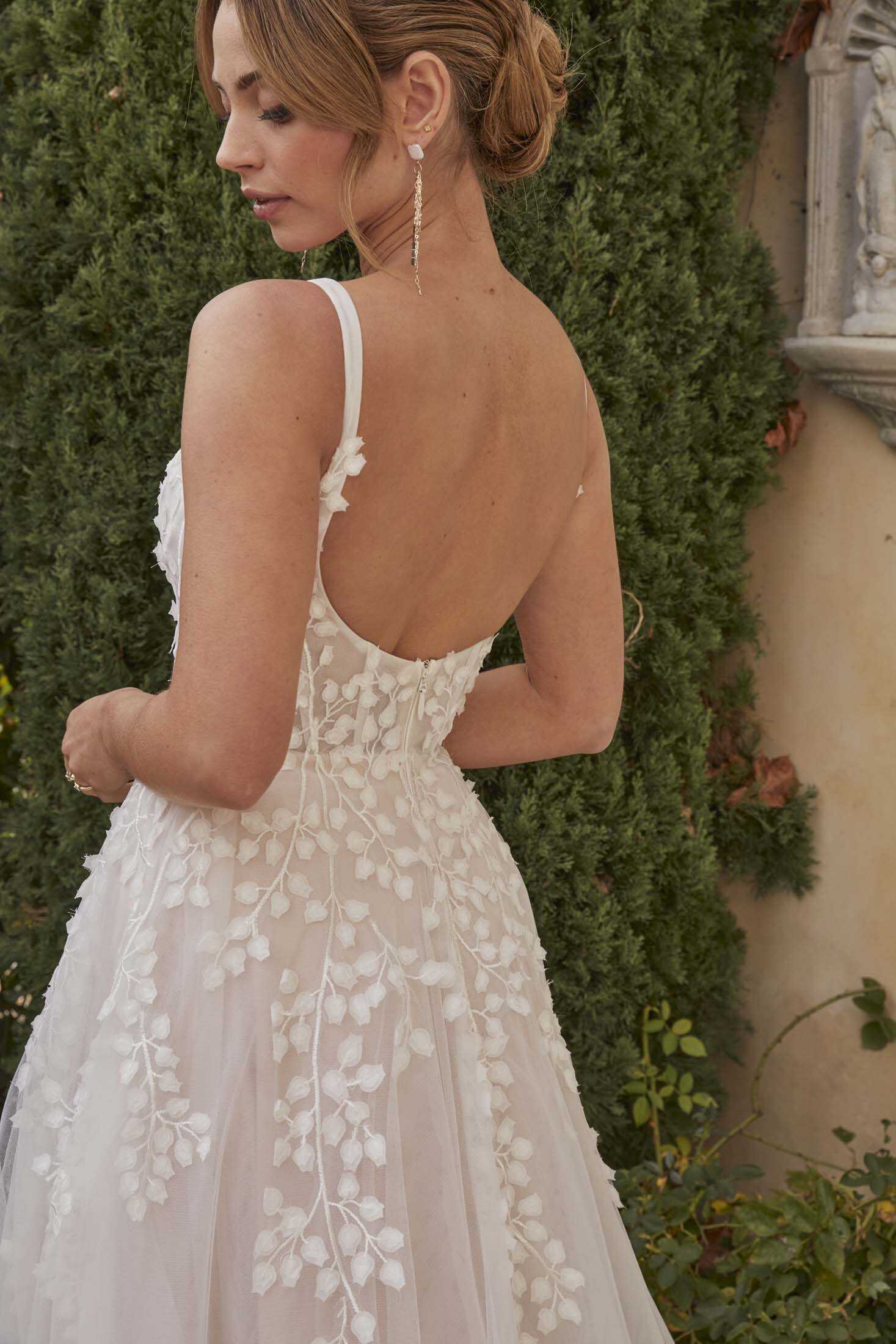 The Dawn wedding dress embodies a delicate yet captivating allure, ideal for the romantic bride seeking an enchanting presence on her wedding day. Crafted from exquisite lace and ethereal tulle, the bustier square neckline adorned with a petal motif front and back exudes timeless elegance with a touch of whimsy. Thin lace and tulle straps delicately frame the shoulders, adding a hint of ethereal charm. The flowy tulle skirt, embellished with intricate floral lace appliqués, cascades gracefully to the floor, while a thigh-high slit offers a subtle yet alluring detail. Inspired by the soft light of the dawn breaking over a serene landscape, this dress is perfect for an intimate garden ceremony or a romantic beach wedding, capturing the essence of natural beauty and timeless romance.