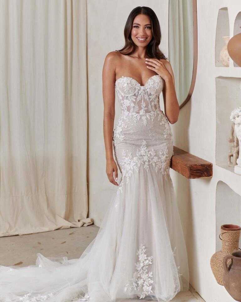 A symphony of intricate details, the Juleswedding dress is where beaded floral appliqués meet the subtle shimmer of beaded tulle. This masterpiece is crafted with a jersey lining, ensuring both comfort and elegance.