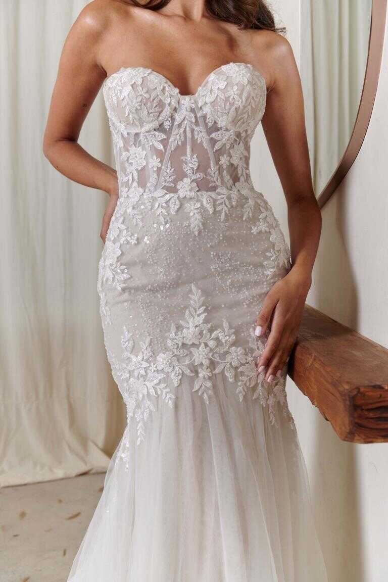 A symphony of intricate details, the Juleswedding dress is where beaded floral appliqués meet the subtle shimmer of beaded tulle. This masterpiece is crafted with a jersey lining, ensuring both comfort and elegance. The illusion bustier bodice, adorned with floral beaded appliqués, offers a touch of vintage glamour, supported by 15 pieces of boning and underwire for a flawless silhouette. The fit-and-flare design, punctuated by a front and back seam positioned 13″ below the natural waistline, flatters every curve. A beaded tulle underlay graces the top half of the skirt, enhanced by delicate beaded appliqué accents. Inspired by the ethereal beauty of enchanted gardens, the Jules gown is tailor-made for the bride who dreams of a fairy-tale wedding, whether in a majestic ballroom or a serene outdoor setting. This dress is the epitome of timeless romance and sophistication.