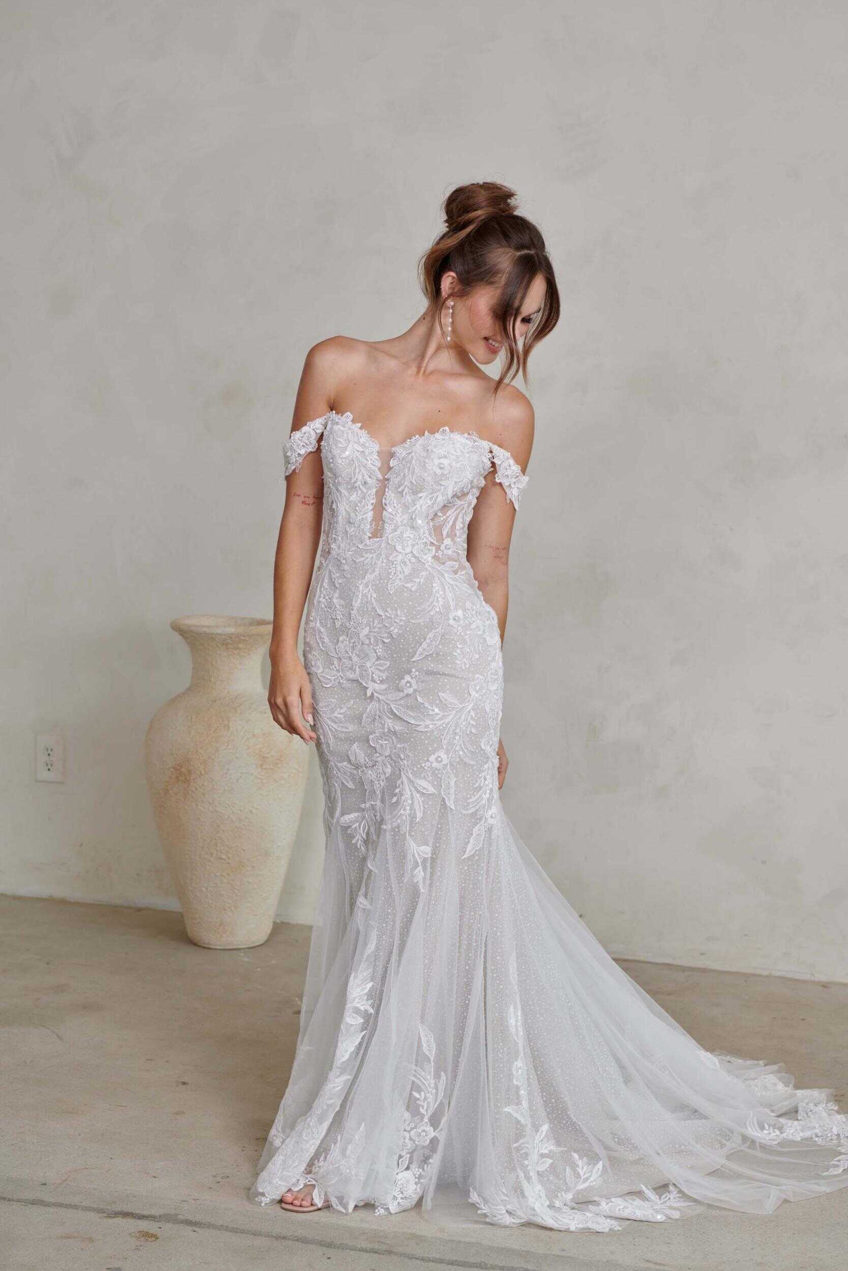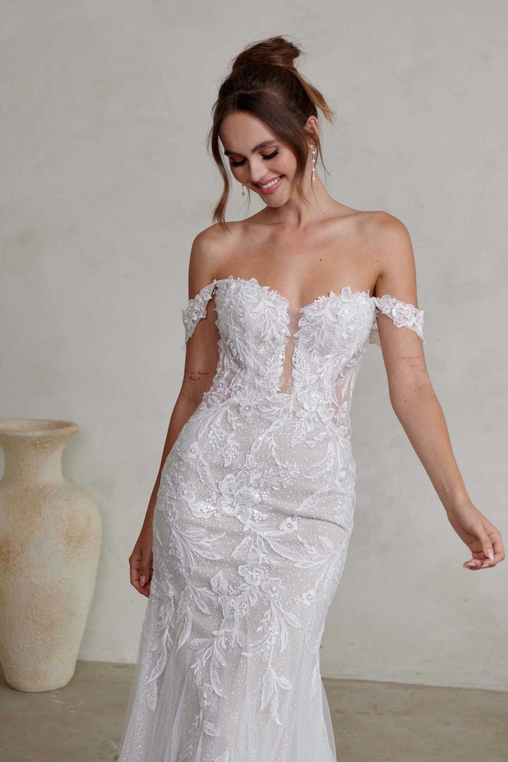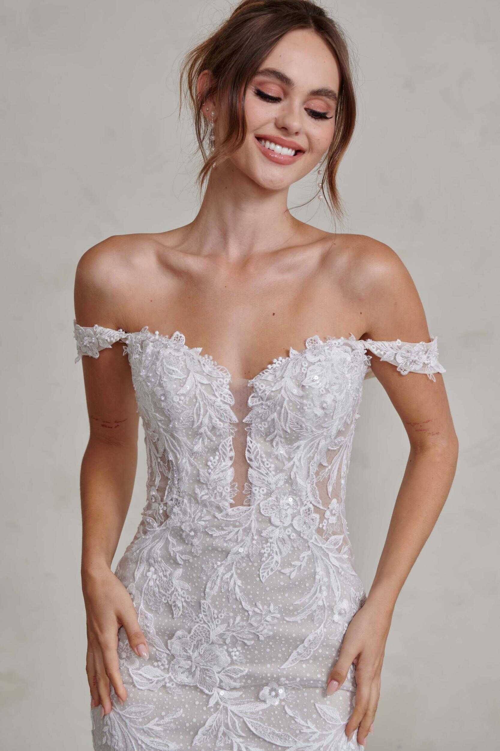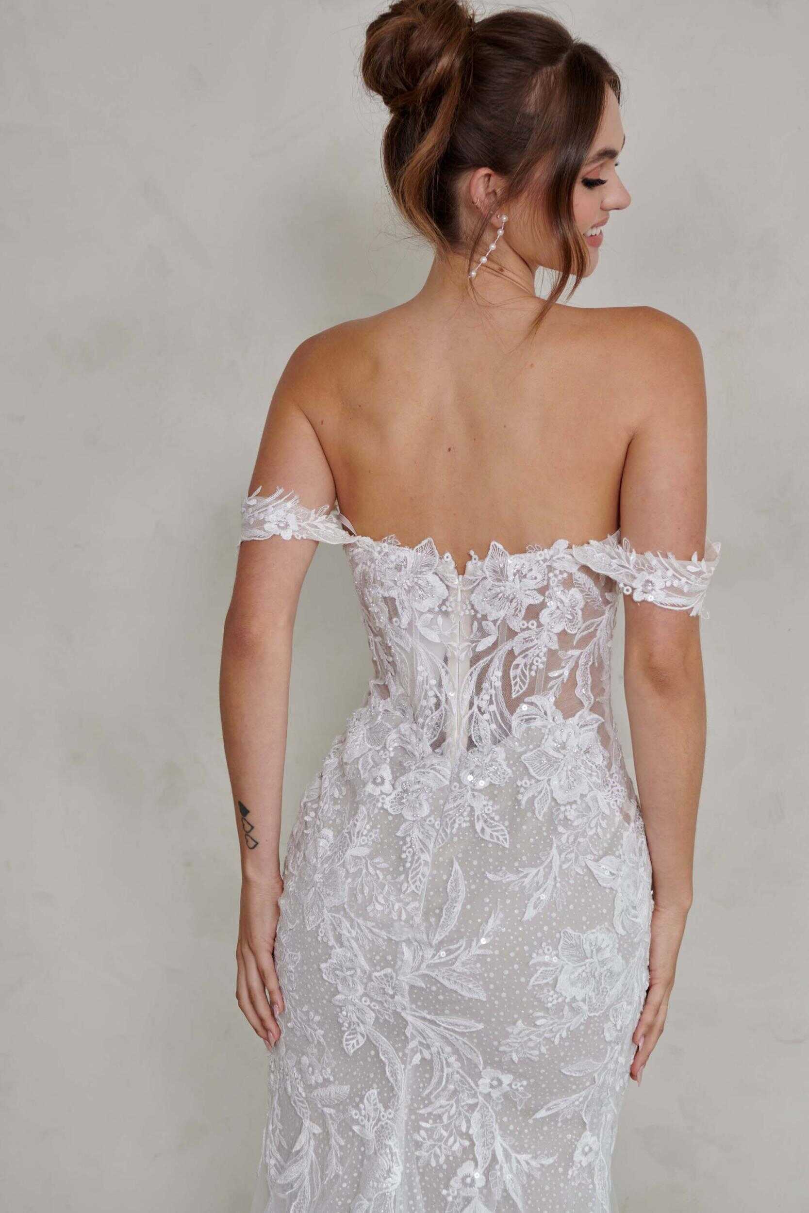 Weaving a tale of enchantment and elegance, the Robin wedding dress is the perfect for the bride who seeks both romance and radiance on her special day. Skillfully adorned with embroidered floral appliques, the dress shimmers with a unique layer of spotted glitter tulle, further embellished with intricate beading and lustrous pearls. A plunging sweetheart neckline, complemented by pointed cups, creates a captivating silhouette, while illusion sides and back add a hint of mystique. Ensuring a sculpted fit, a 12-piece boning structure is harmoniously integrated, closed seamlessly with an invisible zipper. The fit and flare design, accentuated with godet details, gracefully flows to the ground, with floral appliques cascading like a gentle spring shower. Drawing inspiration from the beauty of an English garden in bloom, the Robin gown is ideal for both a lavish estate celebration or a twilight garden affair.